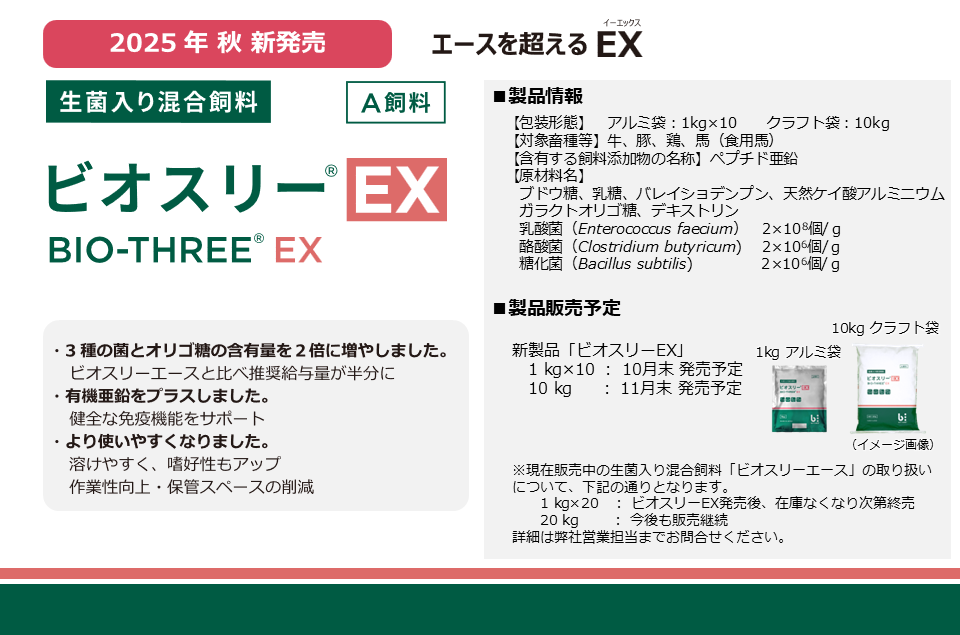 この秋、弊社の主力製品 生菌入り混合飼料「ビオスリーエース」を超える新製品として、「ビオスリーEX」を新発売いたします。