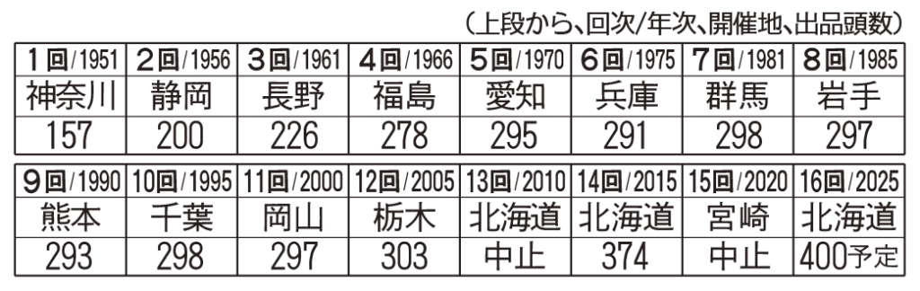 初のホル全共は、戦後の復興が進む1951年、神奈川県平塚市で昭和天皇の行幸を仰ぎ開かれた。以降、「酪農の祭典」としておおむね5年ごとに、過去13回にわたって酪農主要県で開かれてきた。開催地の消費者に日本酪農への理解を深めてもらう場としても活用され、ホル全共のブランド価値を高めてきた。大会の歩みは、乳牛改良の歴史そのものでもある。