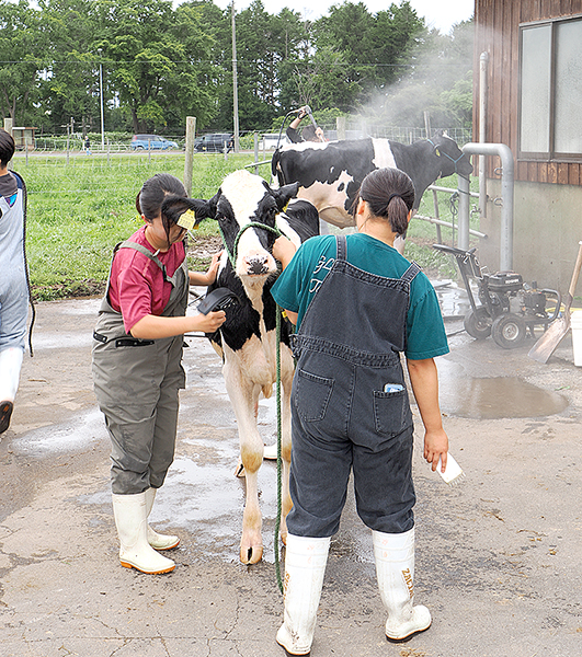 酪農学園大学附属とわの森三愛高校アグリクリエイト科機農コースの共進会班メンバーは1~3年生の19人で構成され、夕方の活動に励む。9月19日の石狩・空知予選会にはジャージー種含め6頭を出品した。餌やりを終えると出品牛を牛舎から出し、高圧洗浄機で体を洗い、ラウンダーを用いた調教やリードの練習など、互いに協力し丁寧に世話をこなしていく。共進会に向けた運営は教師の指導を受けつつ、全員が自主的に進めている。