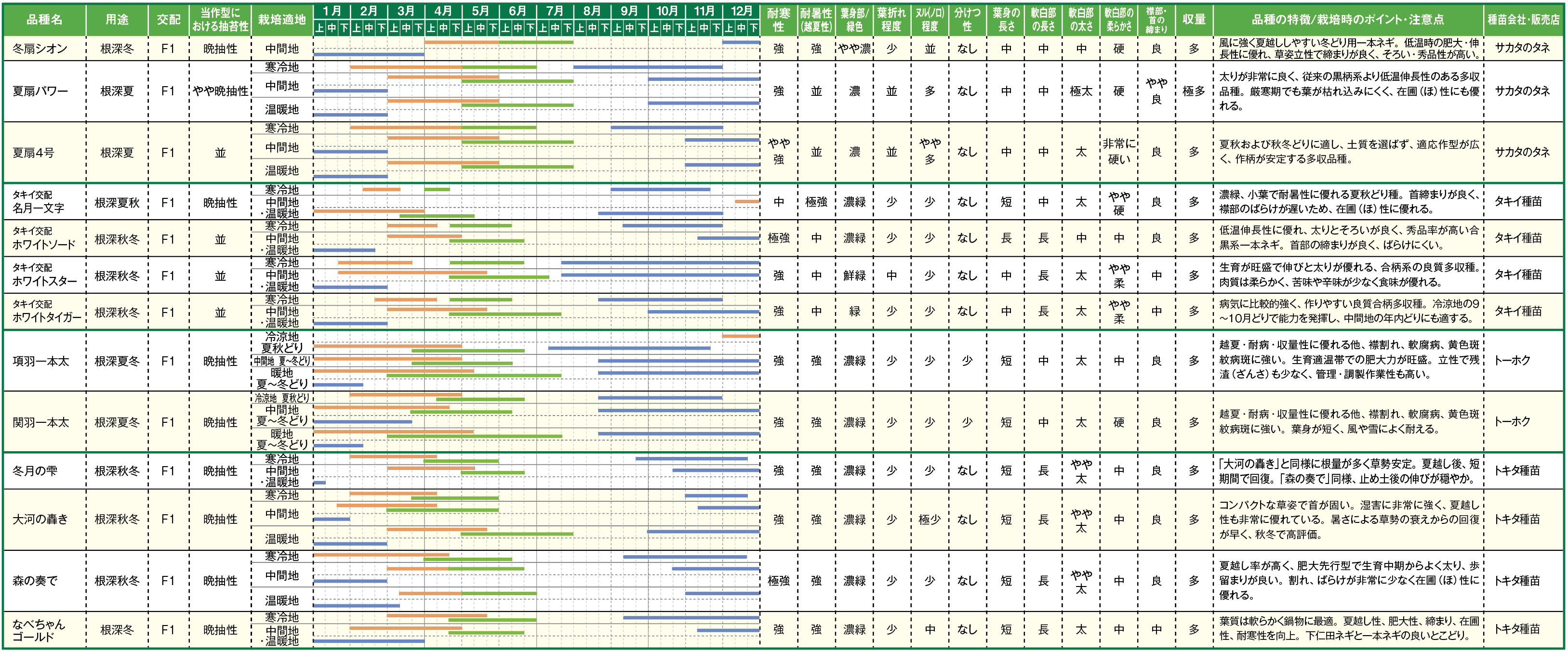 秋冬どりネギは、暑さの厳しい夏季を経た後に収穫時期を迎えるため、気温が下がってから収穫時期を迎えるまでの期間における回復の早さが重要になる。そのため、生育時期である高温期の耐暑性に加えて、収穫時期である低温期の耐寒性が秋冬どりネギの品種に求められる特性として挙げられる。