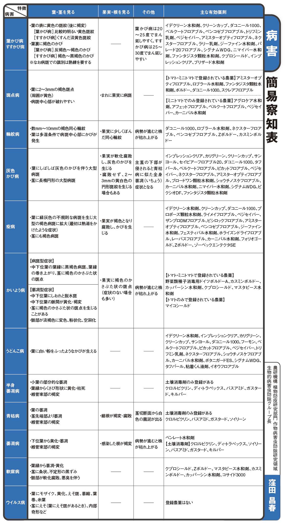高品質なトマトを安定的に生産するためには、病害虫に対する予防や早期対策が大切である。特に夏秋トマトの栽培時期は温暖・湿潤な気候のため、多くの病害虫の活動が活発になる。ここでは、夏秋トマトに発生しやすい病害虫の発生確認ポイントと防除対策の最新情報をまとめた察知表を紹介する。
