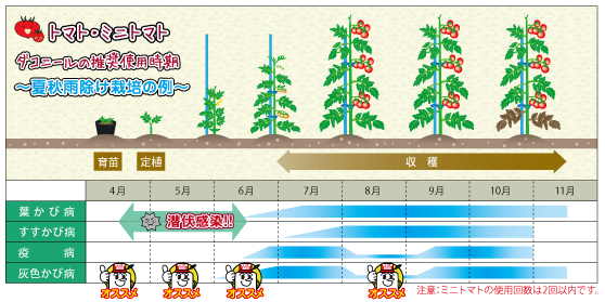 葉かび病・すすかび病は潜伏期間が長く、2次感染以降は一気に圃場に広がります。発病してからの防除では手遅れになるので、両病害に高い効果があるダコニール1000を活用し、発病前・初発確認後から予防散布に努めましょう。