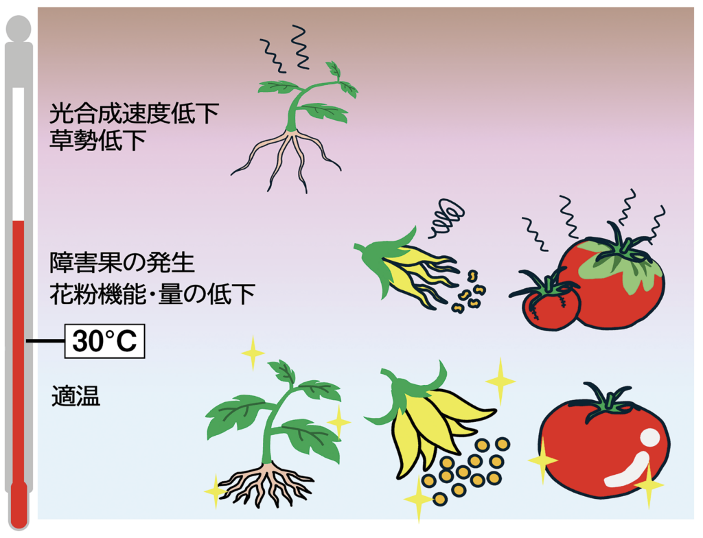 トマトの花、特に花粉は高温に対する感受性が極めて高い。開花前後の時期に高温に遭遇すると、花粉の生理的機能が失われたり、放出される花粉が少なくなったりする。その結果、受粉や受精が行われず、着果不良を引き起こす。