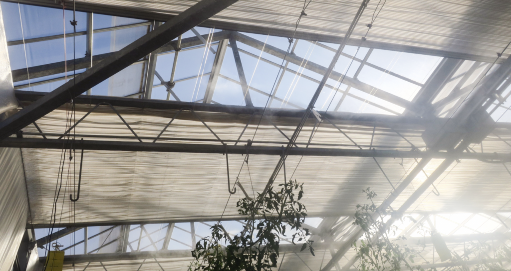 ハウス内にミストを噴霧して気化熱によって温度を下げることができる。2度以上の昇温抑制効果があることが報告されており、昇温抑制以外にも湿度コントロールにも使用できる。