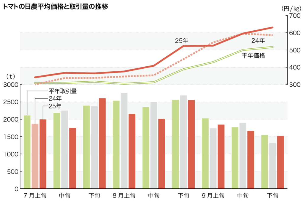 2025年の日農平均価格(各地区大手7卸のデータを集計)は、7月は平年(過去5年平均)比15%高の1kg359円、8月は同31%高の1kg441円、9月は同21%高の1kg580円を付けた。堅調な価格となった背景には、需要が高かったことに加えて、入荷量が不安定だったことも関係している。同時期の7卸取引量は平年比1割減の水準が続いた。