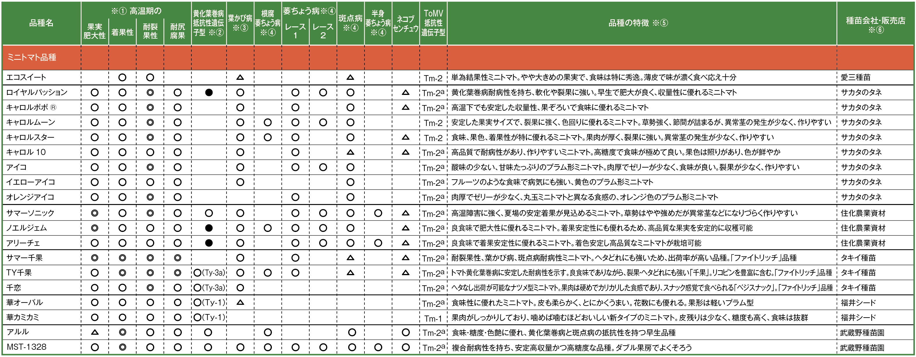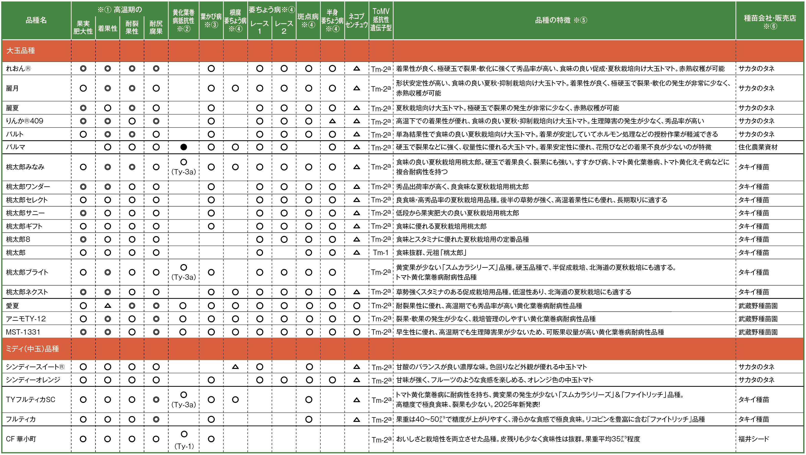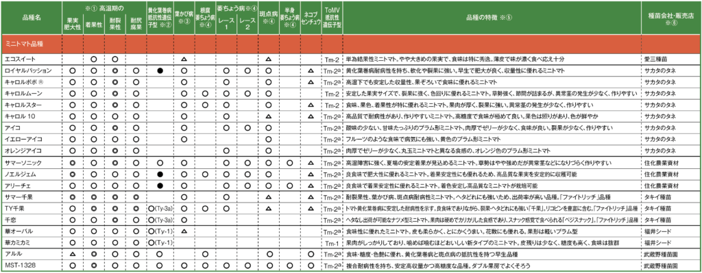 ※①高温期の特性については、メーカーの自己申告に基づき、◎=極めて優れている、◯=とても優れている、△=やや優れている、記載なし=優れていない、不明、とした ※②黄化葉巻病抵抗性は、メーカーの自己申告に基づき、◯=抵抗性遺伝子型Ty-1、Ty-3、Ty-3aを有している、◯※=Ty-2を有している、●=遺伝子型は非公開、とした ※③葉かび病は、メーカーの自己申告に基づき、◯=抵抗性遺伝子がCf-9、または同等レベルの強い抵抗性あり、△=◯よりやや弱い中程度抵抗性あり、とした ※④病害抵抗性は、◯=抵抗性あり、△=中程度の抵抗性あり(耐病性含む)、とした。各品種の抵抗性の強弱はメーカーの自己申告を基本に、農研機構野菜花き研究部門が監修した ※⑤品種の特徴は、各種苗会社によるコメント ※⑥国内育成品種は育成した種苗会社を、海外育成品種は国内の販売店などを記載した