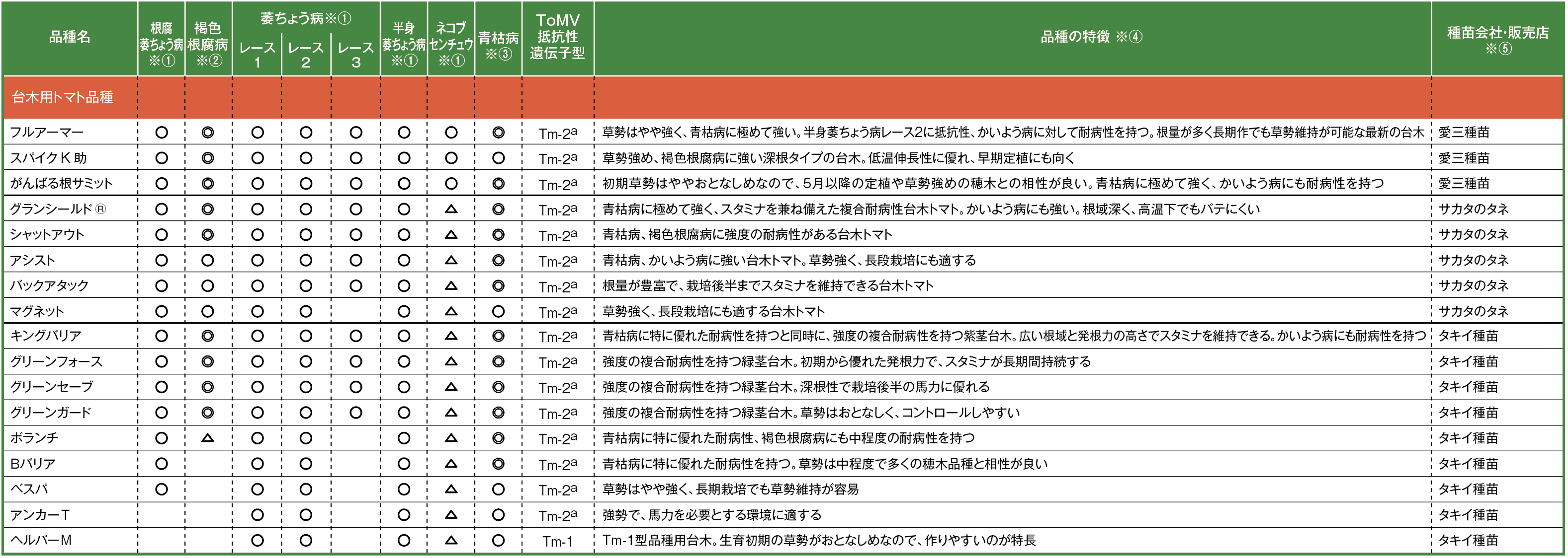 ※①病害抵抗性は、◯=抵抗性あり、△=中程度の抵抗性あり(耐病性含む)、とした。各品種の抵抗性の強弱はメーカーの自己申告を基本に、農研機構野菜花き研究部門が監修した ※②褐色根腐病は、◎=種苗会社のカタログで抵抗性強度が7-9の品種、◯5-6の品種、△3-4の品種、とした ※③青枯病は、◎=種苗会社のカタログで抵抗性強度が8-10の品種、◯=抵抗性強度5-7の品種、とした ※④品種の特徴は、各種苗会社によるコメント ※⑤国内育成品種は育成した種苗会社を、海外育成品種は国内の販売店などを記載した