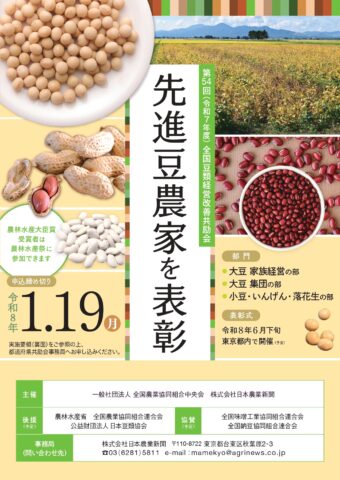 第53回(令和6年度)全国豆類経営改善共励会(主催:全国農業協同組合中央会・JA新聞連)の募集がはじまりました。要領・募集チラシを掲載いたします。なお、要領はワードでもご用意しております。ご要望の方はお申し付けください。